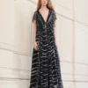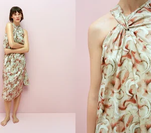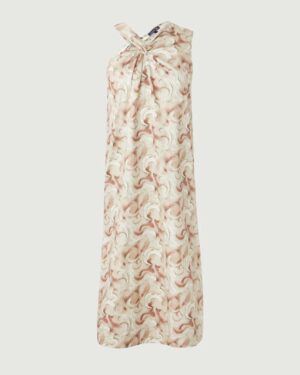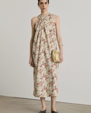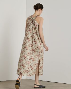 Emna es un vestido largo sin mangas con estampado verde agua y rosa palo que combina a la perfección sencillez y elegancia. Sus tirantes asimétricos retorcidos dejan ver delicadamente los hombros. Su acabado mercerizado le confiere una caída perfecta y una silueta fluída que define la figura y fluye con gracia