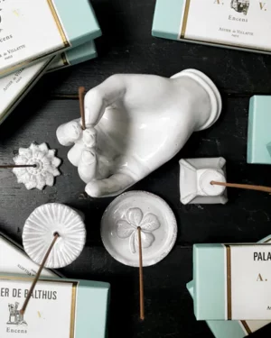 Astier de Villatte es célebre por ser el único estudio de París que mantiene y alberga las tradiciones de la producción artesanal de cerámica. Recuperando los sistemas ancestrales de moldeo y estampación, el jarrón con la impresión «a dozen roses» está elaborado utilizando técnicas medievales que implican moldear una lámina de arcilla a mano, bicocción de la pieza «galleta» y glaseado del producto en esmalte blanco -un largo proceso que implica un tiempo de secado de hasta un mes-