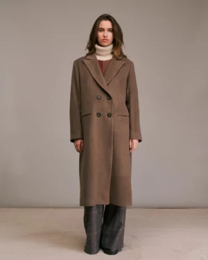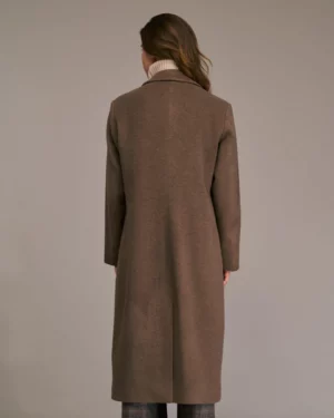 Abrigo largo cruzado con cuello de solapa y mangas largas con charreteras. Con bolsillos de ribete en la parte delantera y una abertura central en la espalda. Cierre de botones visible en la parte delantera
