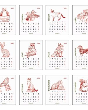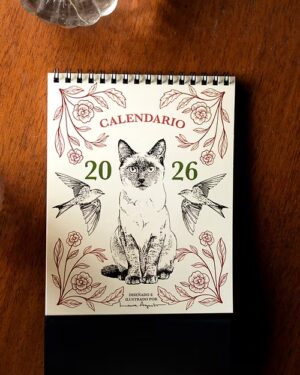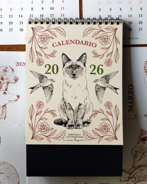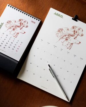 Calendario ilustrado de mesa, compuesto por 12 láminas mensuales de 18 x 14 cm. Impreso en papel Shiro de 200 gr, con refuerzo de cartulina negra de 400 g para mayor durabilidad y encuadernado con espiral negra