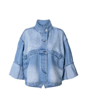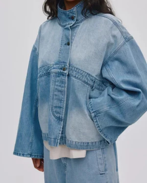 Preciosa chaqueta vaquera que destaca en un material vaquero lavado claro con detalles característicos