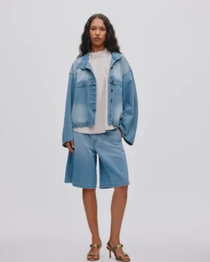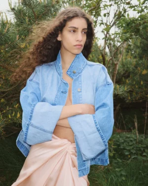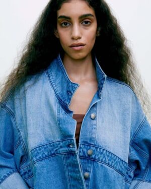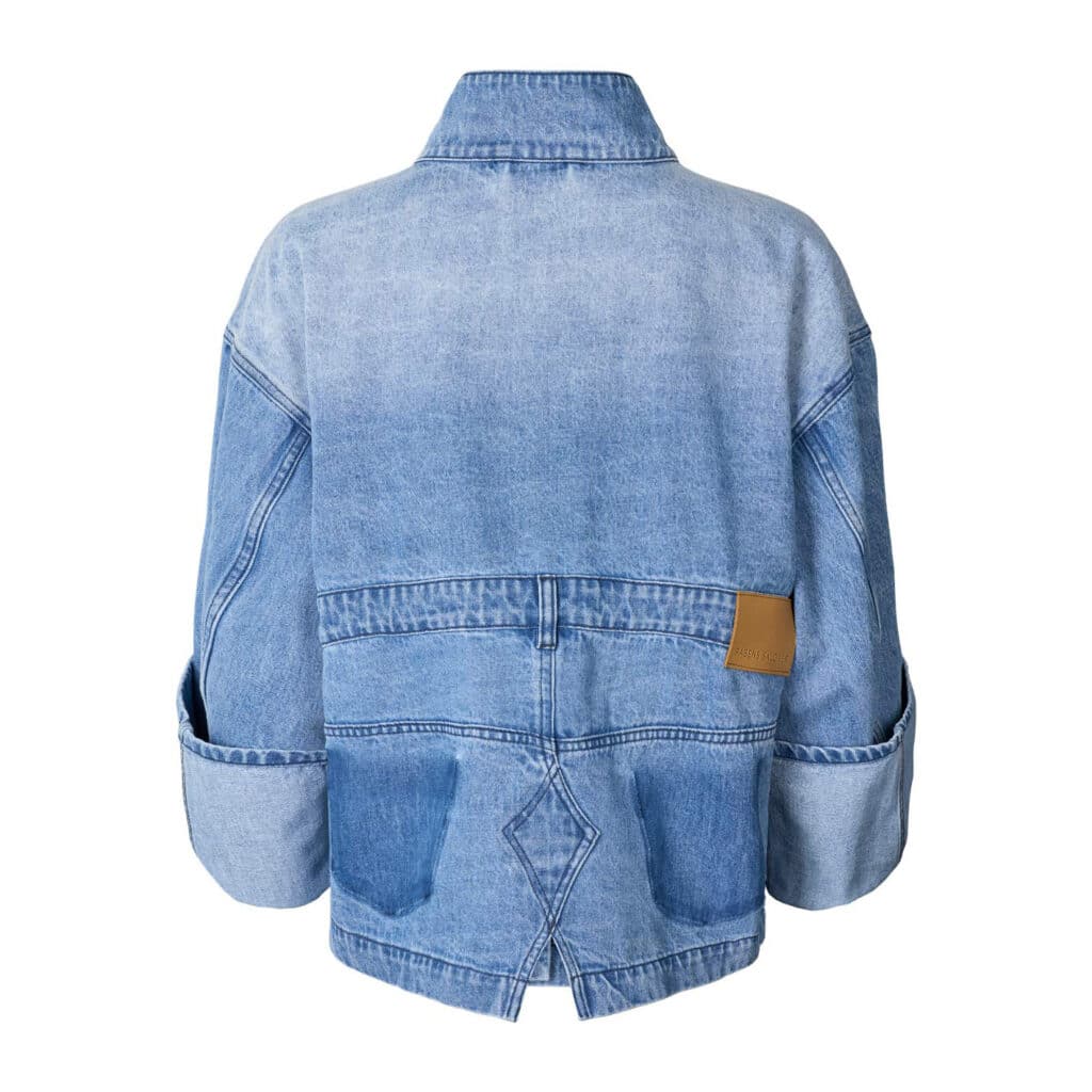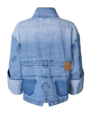 La chaqueta tiene un corte oversize y corto con mangas oversize dobladas, grandes bolsillos laterales, así como cierre de botones en la parte delantera y cuello. El diseño destaca por las presillas del cinturón alrededor de la cintura, etiquetas de bolsillos eliminados y diversas costuras