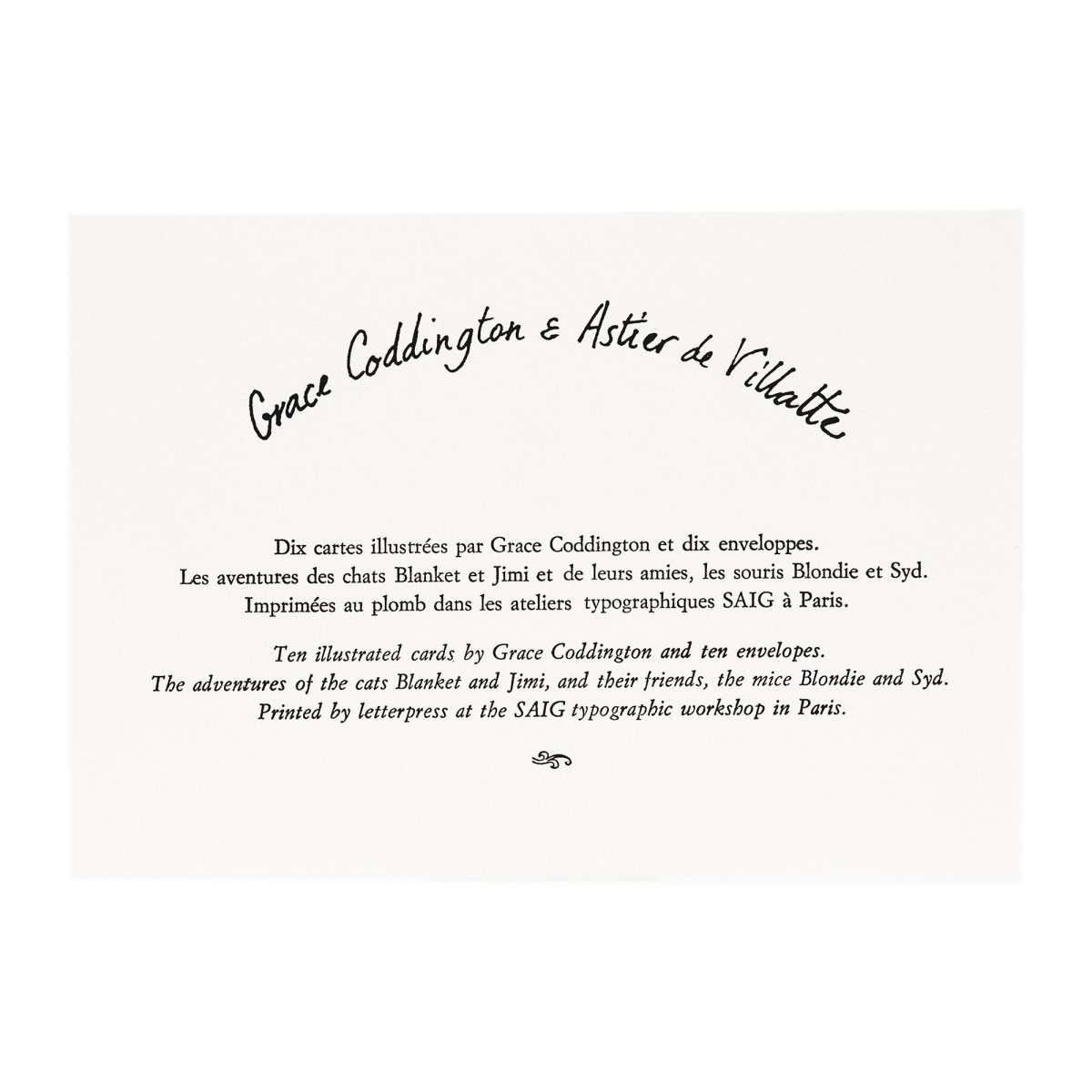 «Grace está muy arraigada en nuestro tiempo, aunque de alguna manera pertenece a otra época, que tal vez podría ser la Inglaterra victoriana. Incluso Astier de Villatte es un poco así, con un pie en el presente y el otro en el pasado: después de todo, no sabemos a qué momento histórico estamos vinculados”, dicen Benoit Astier de Villatte & Ivan Pericoli. En Grace buscaban el «humor y la poesía», atraídos por su mundo y los gatos traviesos que lo habitan.