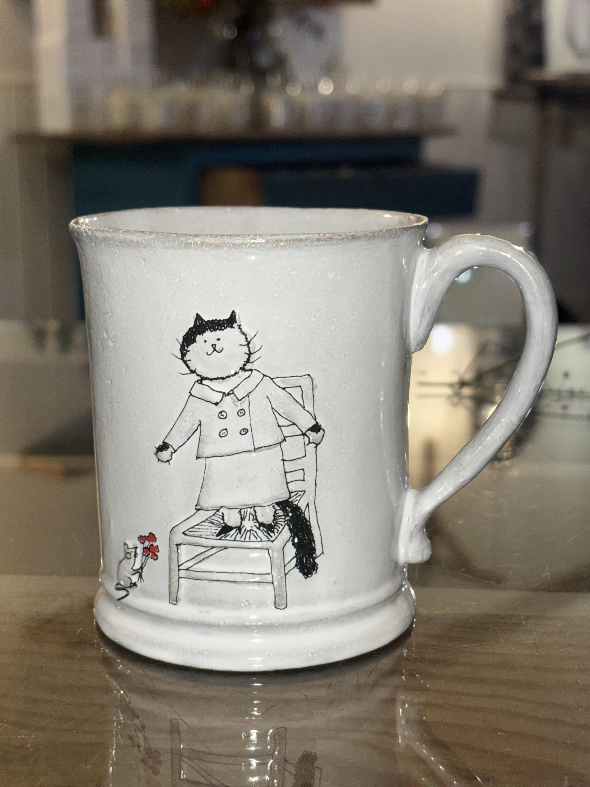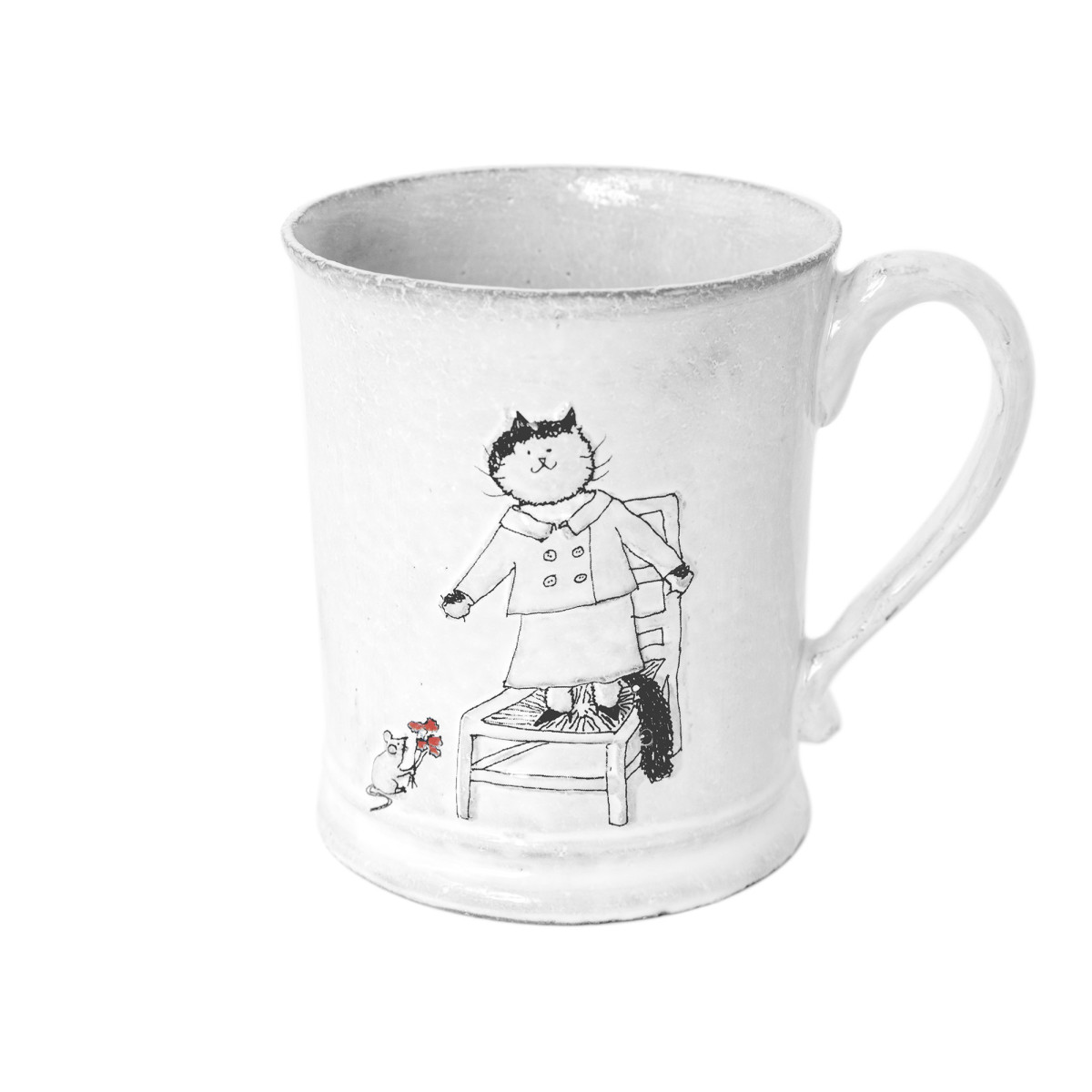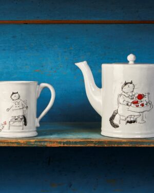 Devotos de la fabricación preindustrial, Astier de Villatte es famoso por ser el único estudio en París que alberga las tradiciones de la producción de cerámica artesanal. Restaurando los sistemas ancestrales de moldeo y estampado, la taza de «Blanket in Love» se realiza utilizando técnicas de la Edad Media que implican moldear una lámina de arcilla hecha a mano, cocer dos veces la pieza de “galleta” y acristalar el producto en esmalte blanco, un proceso largo que requiere un tiempo de secado de hasta un mes. Caracterizada por las encantadoras ilustraciones de Coddington, la taza está grabada con la cresta de la marca, que representa un entrelazado A y V, junto con las iniciales de uno de los 40 maestros artesanos que la crearon. Cada pieza hecha a mano cuenta una hermosa historia, se romantiza e imparte un sentido de nostalgia a su dueño. Haga arreglos con otras tazas de la colección para brindar calidez y aliento a su entorno de té, chocolate o café de la tarde.