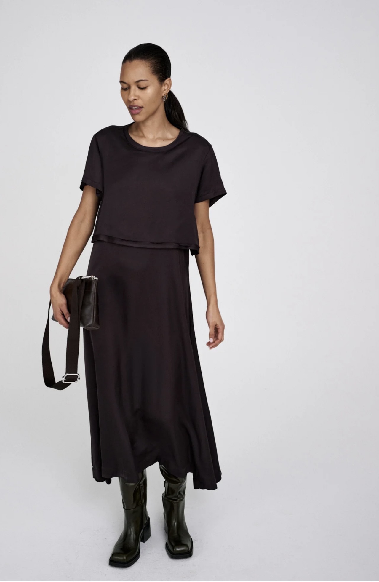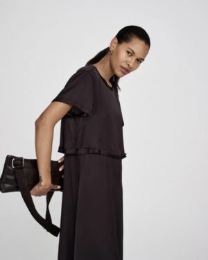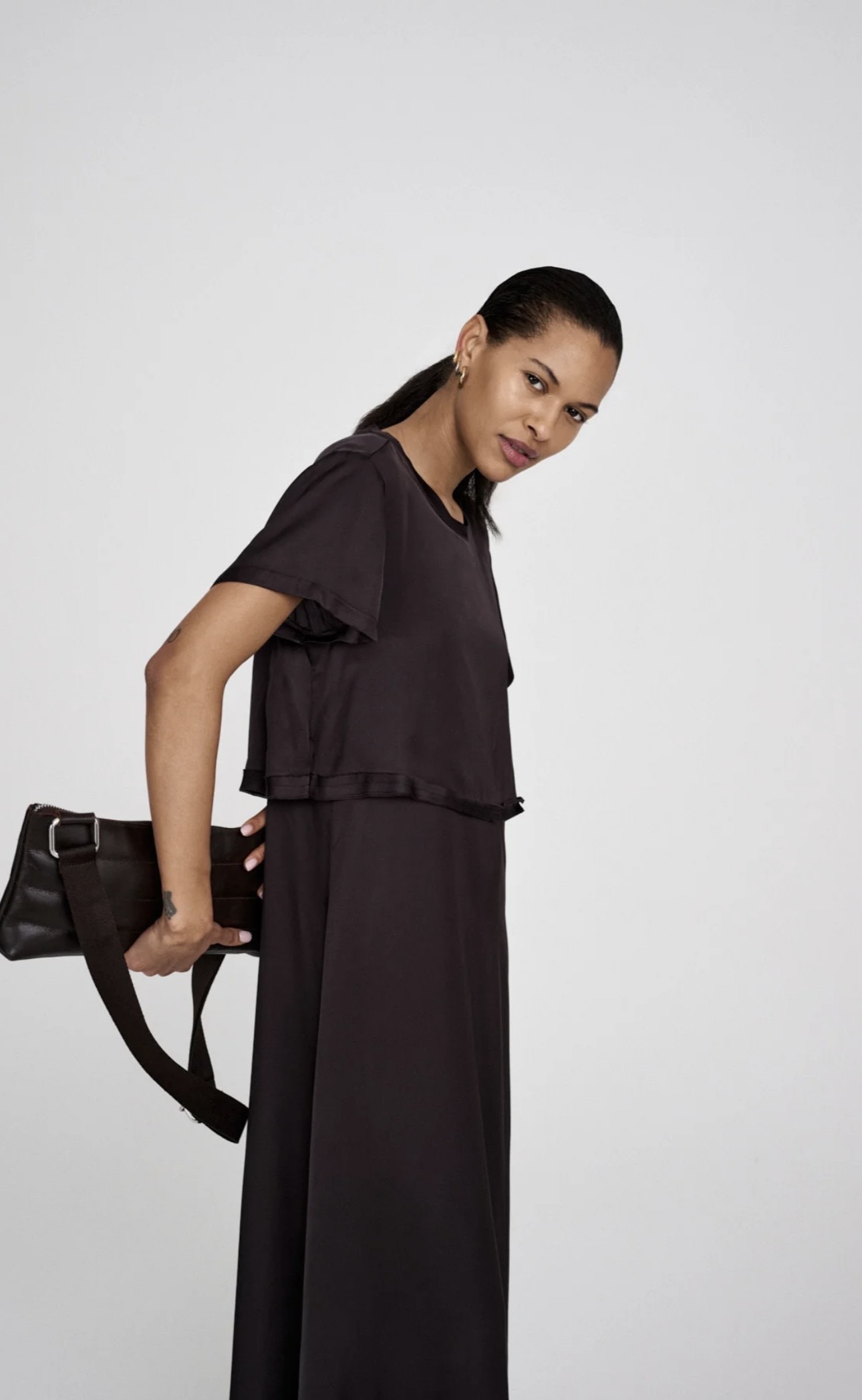 Este vestido largo tipo camiseta se caracteriza por una silueta elegantemente desenfadada con una estética atemporal de “menos es más” que aporta alegría al armario temporada tras temporada
