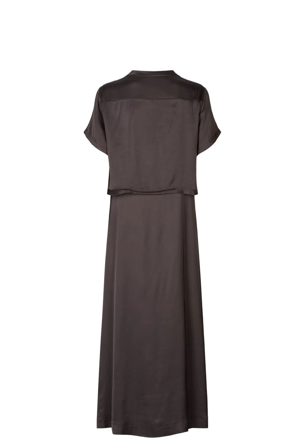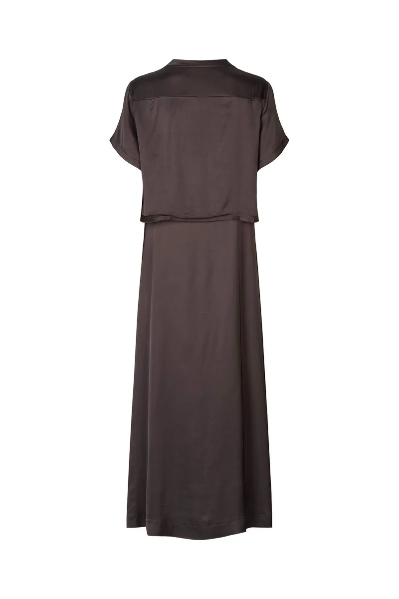 La silueta larga y relajada está diseñada con una parte superior tipo camiseta, mangas cortas y holgadas, un escote redondo y una falda larga con un ligero vuelo