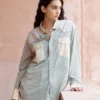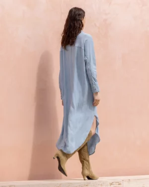 Ligero y fluido, este vestido largo está confeccionado con una refinada mezcla de tencel y lino, ofreciendo una flexibilidad y comodidad inigualables. Su suave y luminoso tono azul cielo se realza con broches de color perlado, inspirados en el mundo occidental, que le aportan un toque de originalidad. Con un pequeño cuello estructurado y mangas largas, logra el equilibrio perfecto entre lo informal y lo elegante. Las aberturas redondeadas en los laterales aportan movimiento y realzan la silueta, convirtiéndolo en la prenda ideal para un look natural y sofisticado
